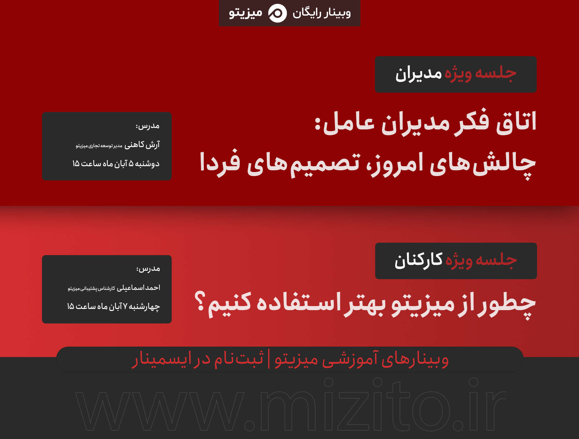در این وبینارها به آموزش بخشهای مختلف میزیتو و قابلیتها و کاربردهای هر بخش، میپردازیم.